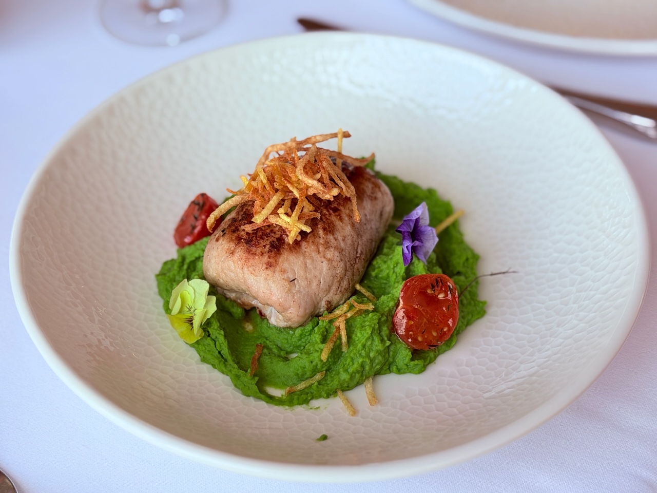 1. Escalope punjen kremom od zelenih rajčica, bosiljkom i dimljenom mozzarellom, na kremi od graška