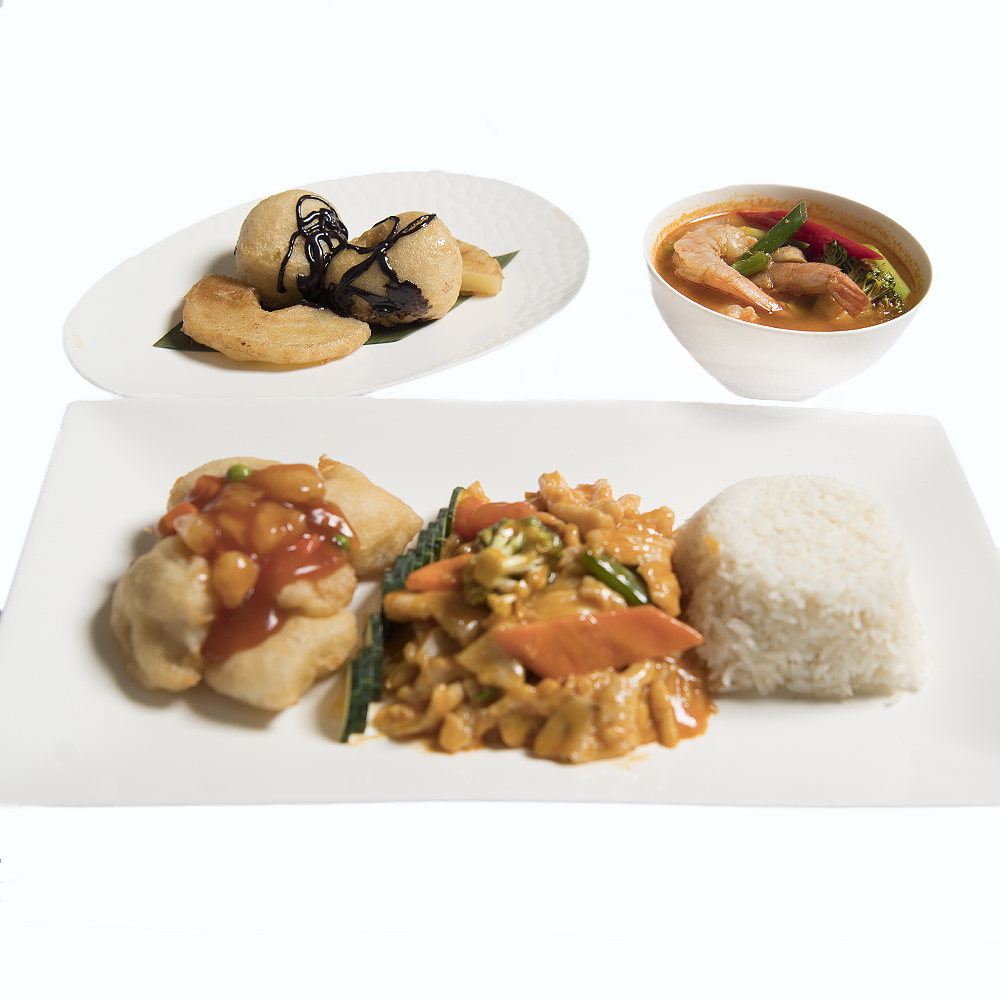 Glavno jelo: Junetina s crvenim thai curryijem / Pohani riblji file sa slatko kiselim umakom + riža