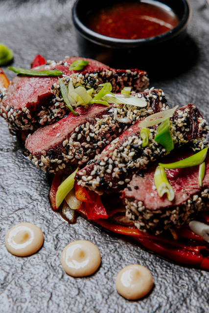 Glavno jelo: Tuna steak – lagano zapečena tuna u savršenom balansu tekstura – hrskavi špinat, svilenkasta krema od avokada, confit rajčica i nježni aioli