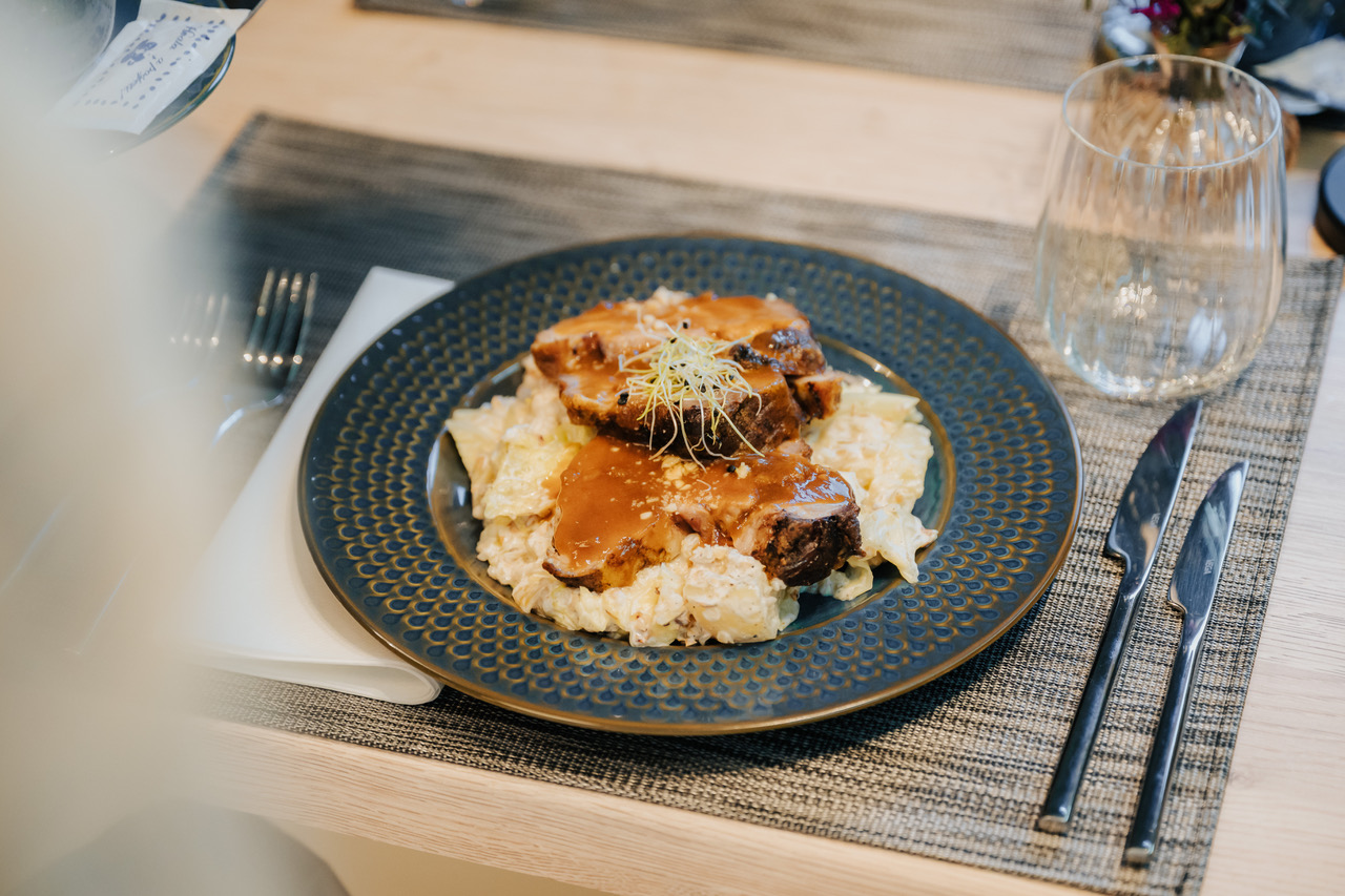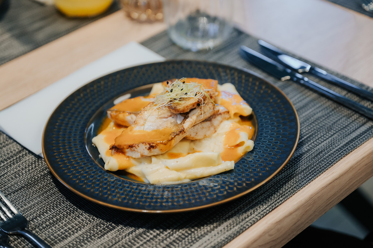 Glavno jelo: File smuđa, krumpir salata, maltagliati tjestenina, umak smeđi maslac, vrhnje, fish perkelt umak