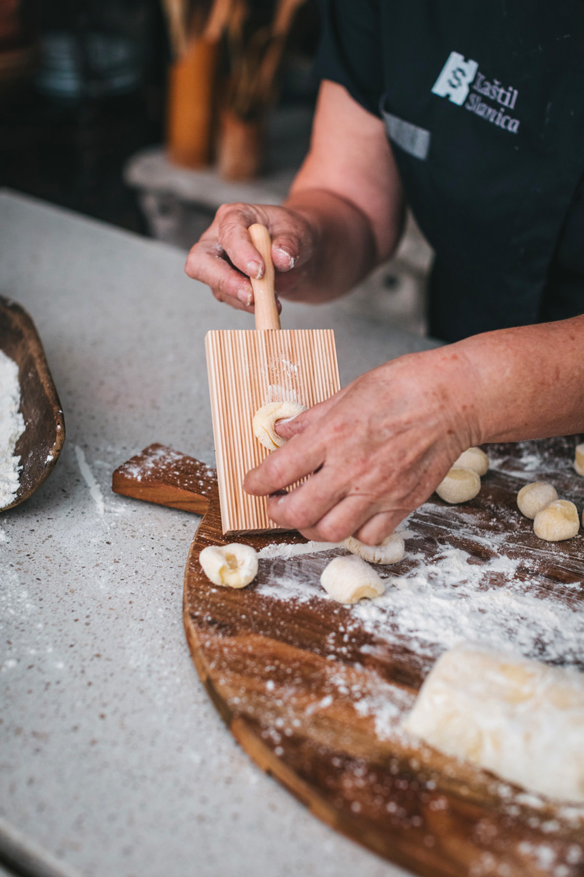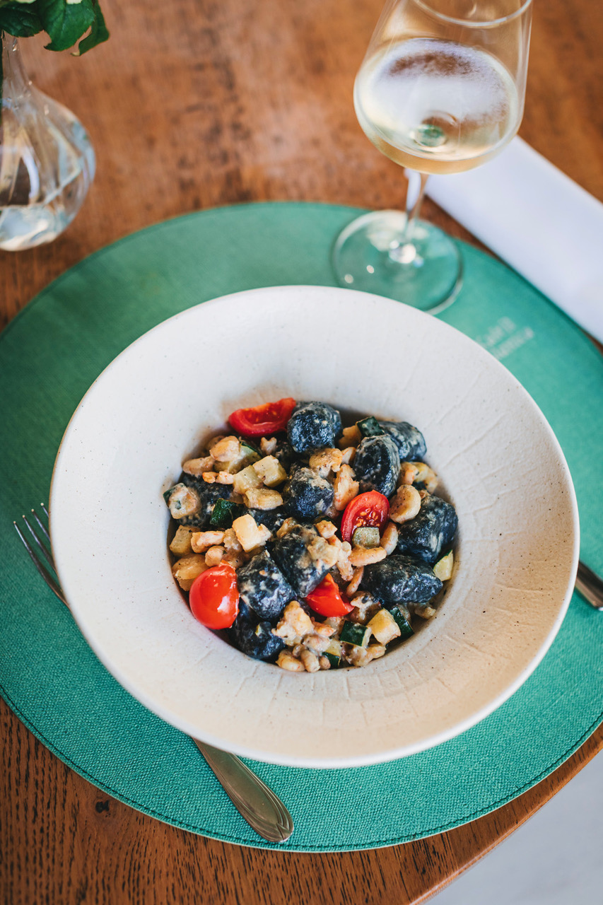 2. Crni njoki s kozicama – domaći njoki s crnilom sipe u umaku od jadranskih kozica, tikvica, cherry rajčica, ekstra djevičanskog maslinovog ulja i bijelog vina