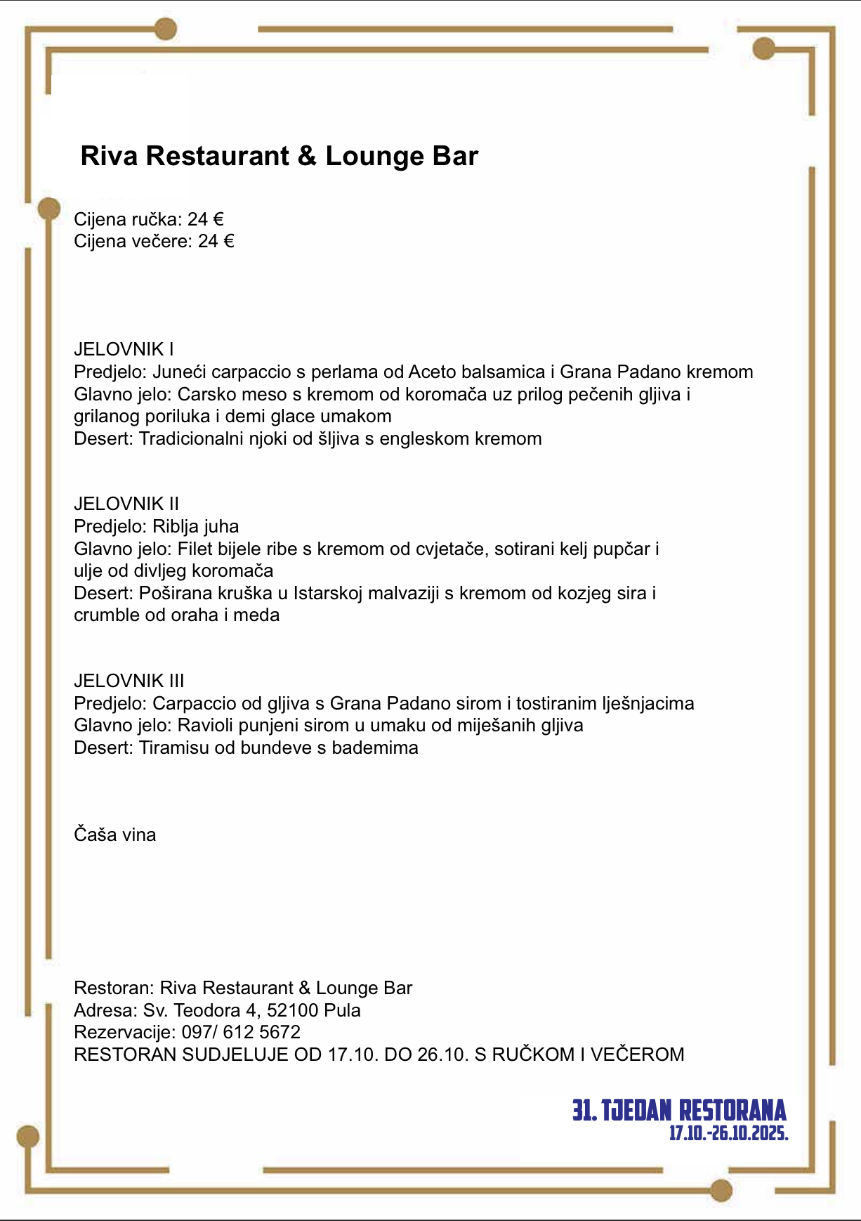Restoran i lounge bar Riva nalazi se na top lokaciji u Puli, na samoj rivi s pogledom na more. Doručak i večera u prvom redu do mora, posebno je iskustvo u samom centru grada! U iznimno ugodnom ambijentu novouređenog prostora poslužuju se vrhunska jela istarske kuhinje, pizze i deserti.