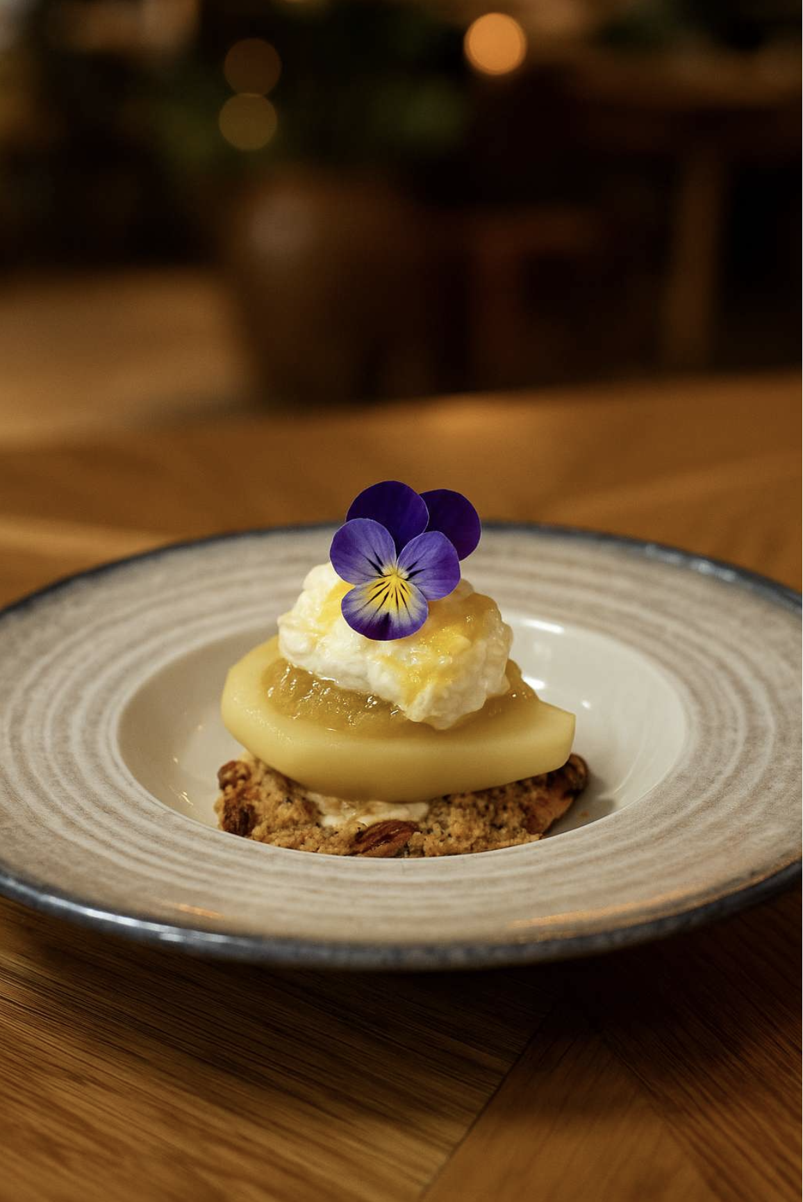Desert: Poširana kruška u Istarskoj malvaziji s kremom od kozjeg sira i crumble od oraha i meda