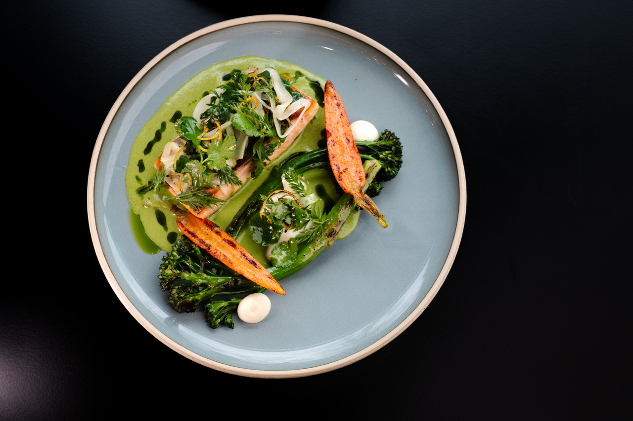 1. Losos file – umak od peršina i limunske trave, mlada brokula, mrkva i krema od cvjetače, salata od paljenog limuna, komorača i listobva mrkve i korijandera
