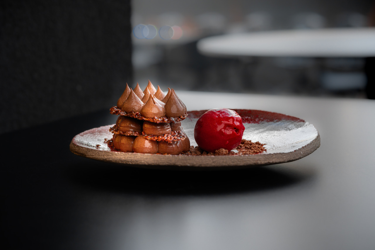 2. Mille feuille, cacao nibs, choco cremeaux, sorbet od malina