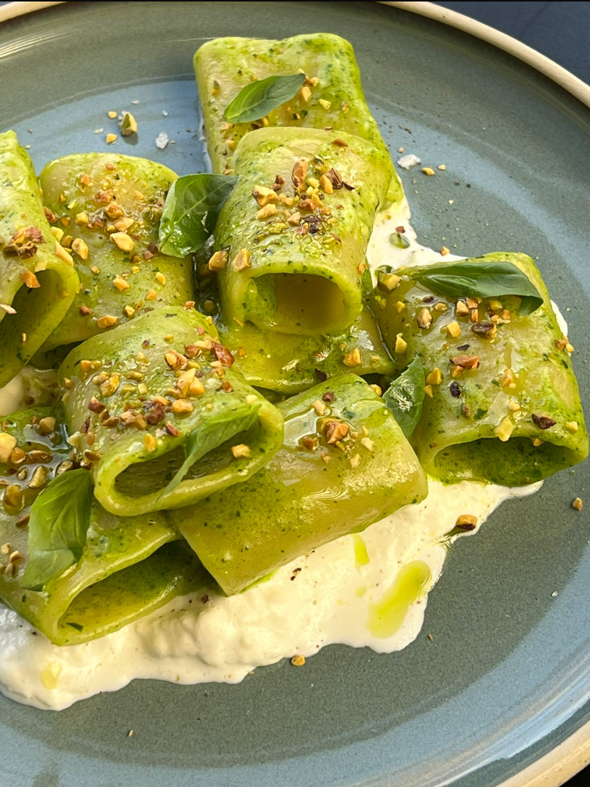 3. Paccheri s pestom od bosiljka, Buratta, pečeni pistacijo, domaći pesto od bosiljka