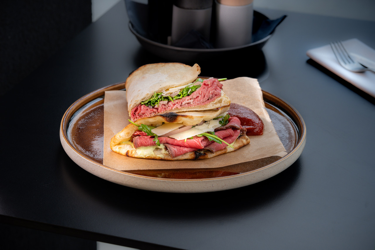2. Roastbeef piadina – pesto i domaća majoneza, ukiseljena ljutika, Grana Padano, džem od pečene paprike